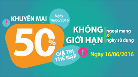 Vào ngày 16/06/2016, Viettel bung ra đợt khuyến mại thẻ nạp đầu tiên của tháng với những ưu đãi vô cùng hấp dẫn dành cho các thuê bao đang sử dụng mạng Viettel. Theo đó, thuê bao Viettel khi nạp thẻ bất kỳ mệnh giá nào từ thời điểm 00h:00:00 đến 23h:59:59 ngày 16/06/2016đều được cộng thêm 50% giá trị thẻ nạp. Số tiền khuyến mại sẽ nằm trong tài khoản khuyến mại và khách hàng được quyền sử dụng để liên lạc nội mạng, ngoại mạng, tùy theo gói cước đang dùng với những chính sách linh hoạt riêng biệt: